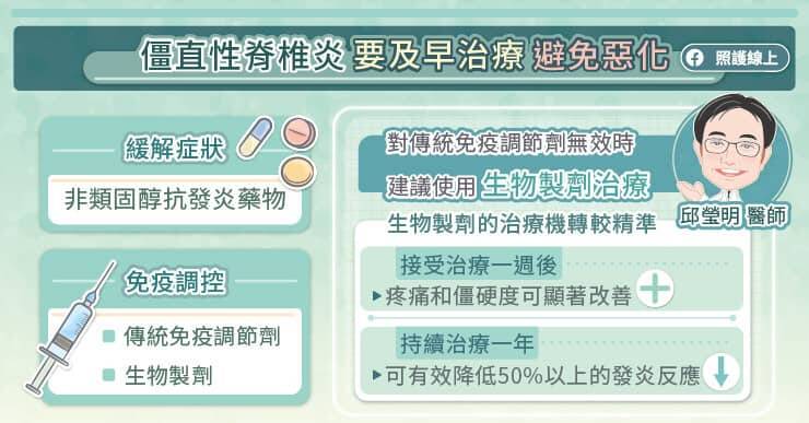 ● 僵直性脊椎炎的治療,會先使用口服的非類固醇抗發炎藥物,幫助緩解症狀。僵直性脊椎炎是自身免疫過度反應引起,使用傳統免疫調節劑及生物製劑,更能控制發炎的狀況。