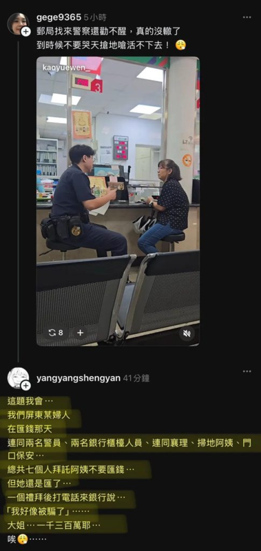 原文由 蔡店連 於 2019-08-13 00:41 發表 幾個月前,我在路邊買冰紅茶,賣紅茶的歐巴桑和我很熟,就說了一個詐騙案例;某天,天氣超熱,有一個中年人牽著機車,走到她的攤位前...汗流夾背的說:[阿姨,我車子壞了,我想牽到前面的機車行修理,身上沒錢...你有沒有五百塊 ...