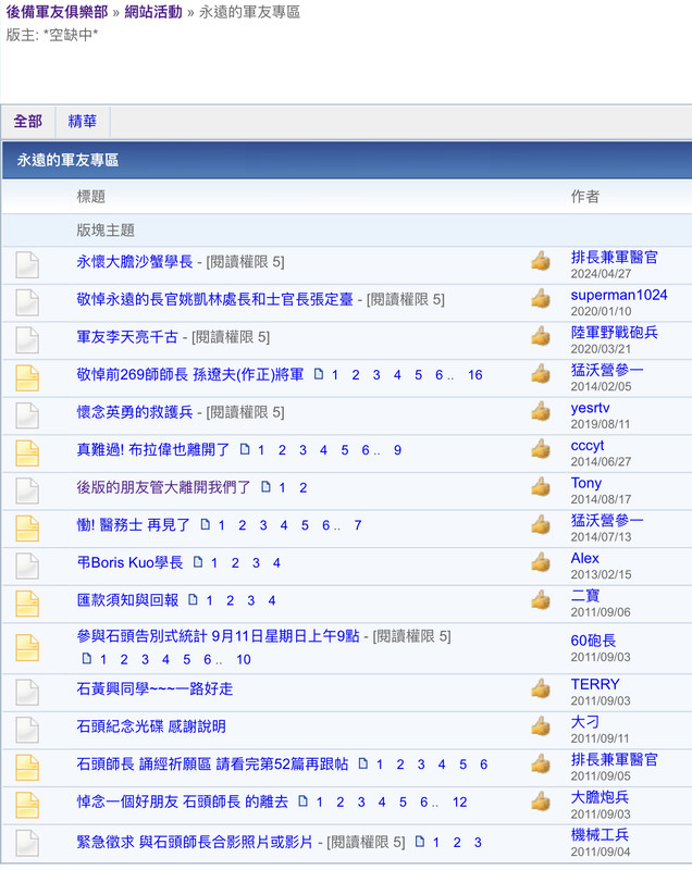 原文由 白目東 於 2026/04/14 23:02 發表 https://army.chlin.com.tw/BBS/re ... o=lastpost#lastpost 很久沒出現也沒出聲,不知道還有沒有認識我的老朋友? 自從臉書社群興起之後,後板的人氣就降了很多,連帶的跟很多老朋友都失聯了,突然想到上來留言就是想跟大家說一下 創立臉書外島兵俱樂部的後板板友41dennis,已於4/8日圓滿樹葬在陽明山 想想從最早的石頭,到宋藥師,到一生懸命,勁桑,再到最近的dennis,不知不覺20年來已有不少老朋友離開了 願各位日後身體安好,生活平安 BY 阿東 ...
